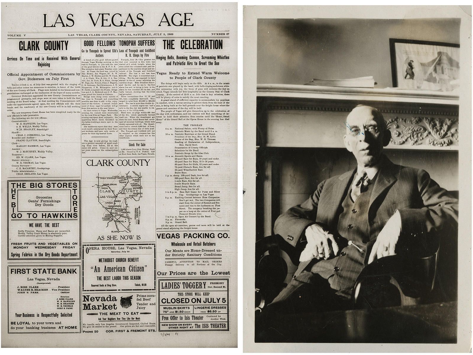 1908Charles Squires bought the Las Vegas Age newspaper in 1908. He became the community's chief advocate for creation of Clark County, city incorporation, women's suffrage, and development of the Colorado River for power and water, helping launch the campaign that led to the construction of Hoover Dam.